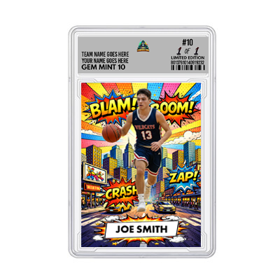 Create custom trading cards that comes professionally sealed inside a premium clear case, topped with a certificate label for that authentic pro-card feel.